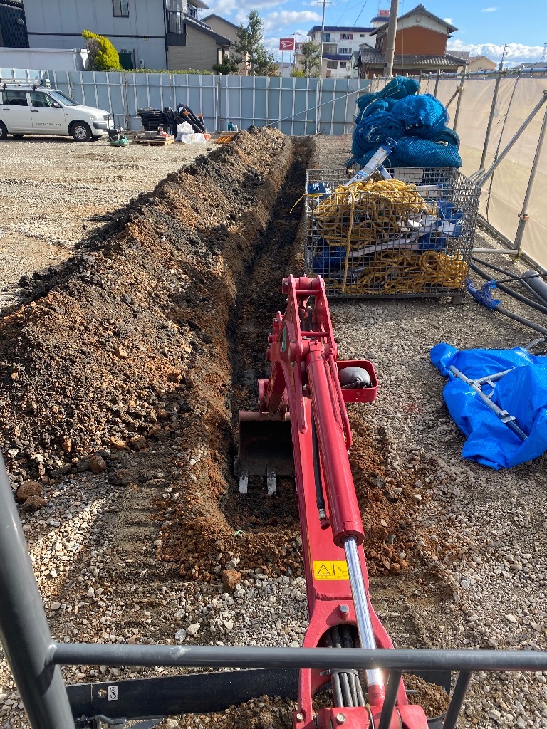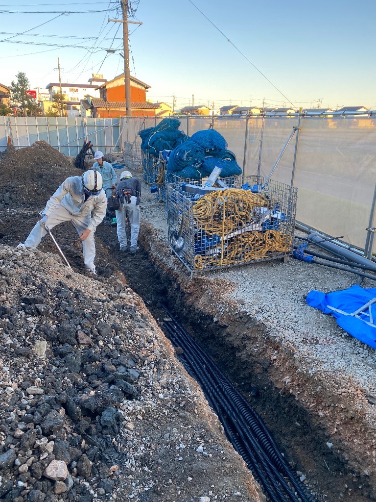 掘った後は配管を敷き詰めて、埋設シートを敷き、埋め戻します。